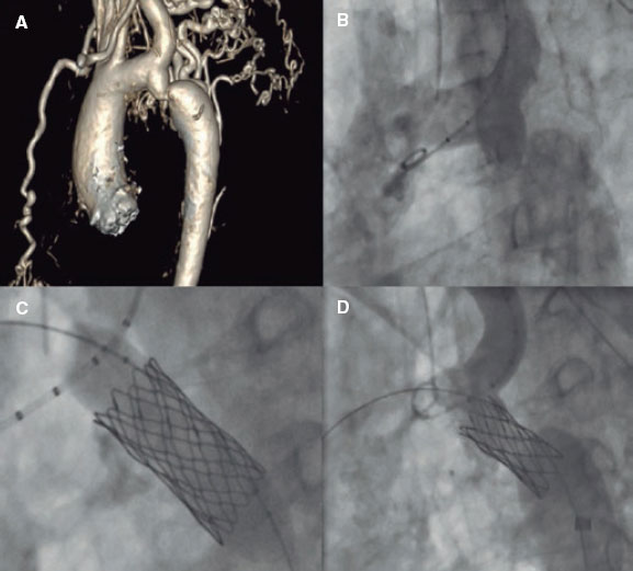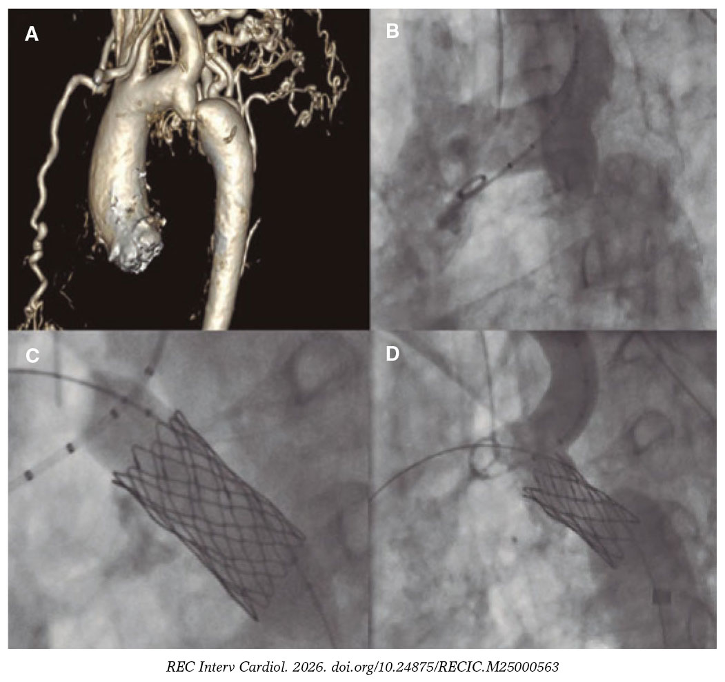 Figura 2. Tratamiento exitoso de una coartación aórtica en un adulto. A: tomografía computarizada con resultado de coartación aórtica. B: angiografía que confirma la presencia de coartación aórtica. C: angioplastia con balón e implante de stent. D: resultado fluoroscópico final tras implante de stent.