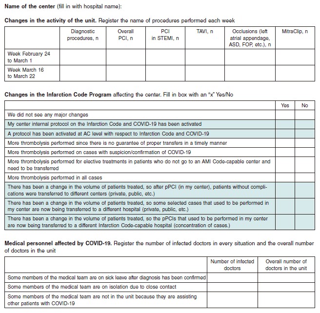 ACI-SEC Working Group on the Infarction Code has developed different actions to promote specialized networks for the management of myocardial infarction and percutaneous coronary intervention as first-line of therapy for patients with ST-segment elevation myocardial infarction (STEMI). One of the main actions taken is the Infarction Code Registry. During 2019 and for 3 months this registry collected data from 5241 consecutive patients in whom the infarction code had been activated in 81 public centers from specific care networks in the 17 Spanish autonomous communities. Using the specific infrastructure of this registry, ACI-SEC has conducted a survey to quantify the degree of damage caused by the COVID-19 pandemic to the catheterization laboratories of our country with special attention to how the infarction code actually works.
