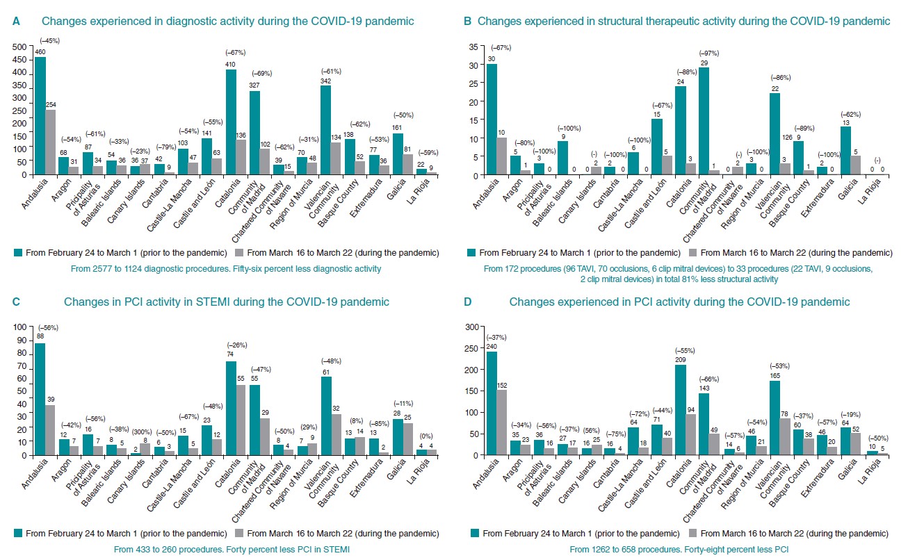 Conclusions: An important reduction in the activity in interventional cardiology has been observed during the COVID-19 epidemic. Likewise, a great decrease has been detected in the number of patients treated in the STEMI networks, with the risk of increased morbidity and mortality that this represents. Scientific societies and health authorities have to promote that patients presenting STEMI compatible symptoms proceed with no delay to access the health system to receive reperfusion treatment in an appropriate way.