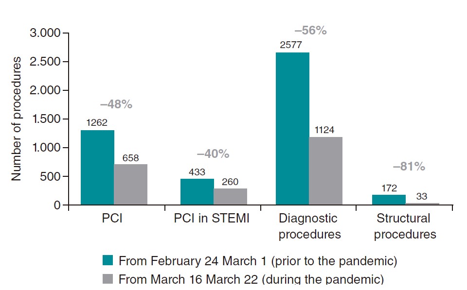 The primary objective can be divided into 3 main points: a) quantify the changes in the volume of patients assisted by the healthcare system: diagnostic procedures, therapeutic coronary interventional procedures, therapeutic procedures for the management of structural heart disease, and therapeutic procedures in the STEMI setting; b) assess the changes caused to the activity of the infarction code by the COVID-19 pandemic; and c) assess the impact of COVID-19 on interventional cardiologists health status and activity.