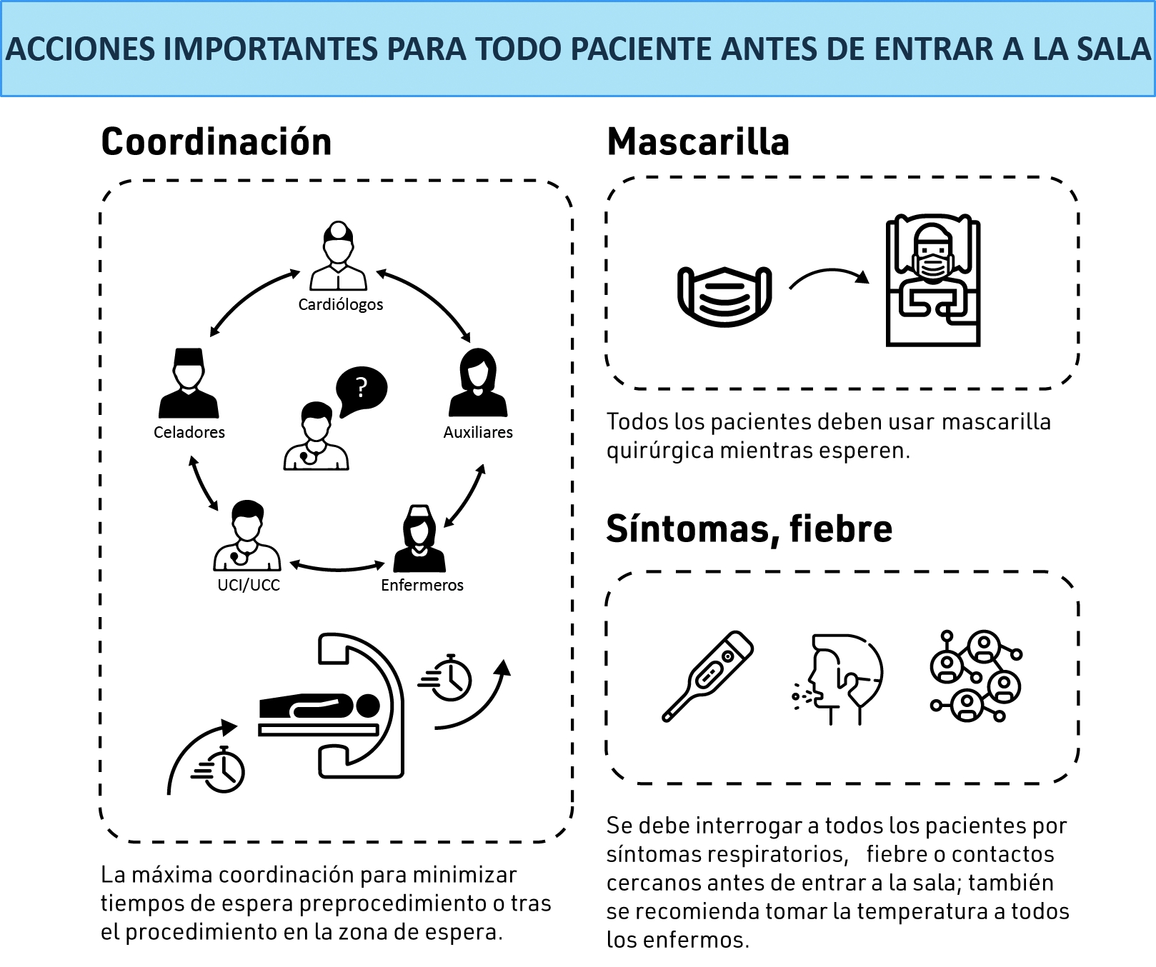 Ante la emergencia creada por el brote de coronavirus COVID-19, la inmensa mayoría de las salas de hemodinámica y electrofisiología han visto alterada su actividad habitual. Además se enfrentan a la realización de procedimientos en pacientes con diagnóstico confirmado de COVID-19 o con la incertidumbre en casos no confirmados. Por otro lado, las unidades de cardiología intervencionista son, por lo general, unidades cerradas en cuanto al agrupamiento del personal sanitario implicado. Esto supone una situación de riesgo para la prestación asistencial en caso de cuarentenas decretadas en unidades particulares.