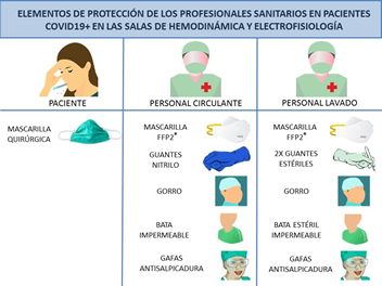 - Médicos y enfermeros: lavado de manos, bata reforzada impermeable con puño (si la bata no es impermeable, se deberá añadir un delantal de plástico), doble par de guantes (cuyo uso se recomienda en algunas comunidades autónomas), gafas antisalpicadura o gafas convencionales y pantalla, gorro y mascarilla filtrante de alta eficacia FFP2 en caso de disponibilidad4 (para procedimientos como implante de desfibriladores, marcapasos y prótesis transcatéter, se debe colocar una mascarilla quirúrgica por encima de la mascarilla FFP2). Se recomienda uso de zuecos cerrados o, en su defecto, calzas.