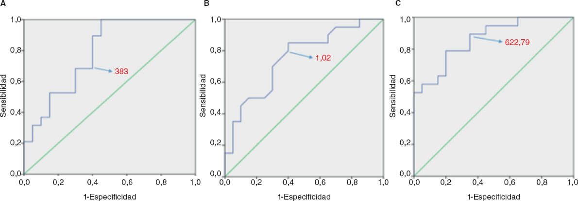 Figura 2. Curva receiving operating characteristic (ROC) para predecir la rotablación según la puntuación Agatston por lesión (A), los niveles de creatinina sérica (B) y al índice CAC-Cre (C). Los umbrales óptimos para predecir la rotablación fueron 383 puntos en la escala de Agatston por lesión, niveles de creatinina de 1,02 mg/dl y un índice CAC-Cre de 622,79, respectivamente.