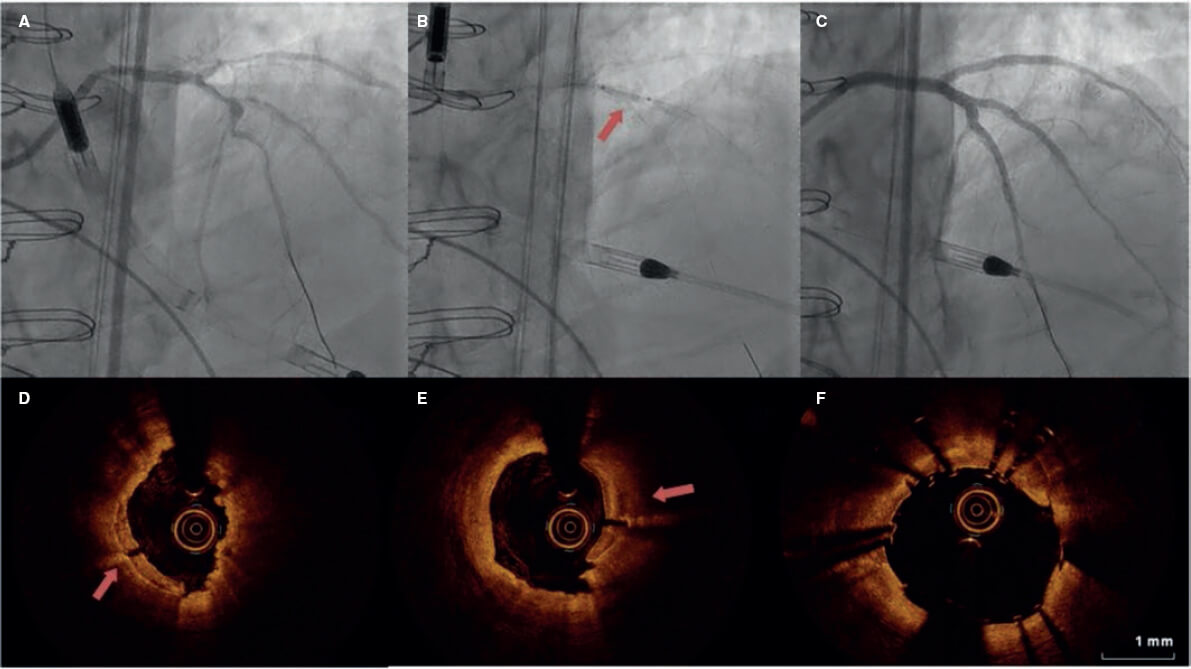 Figura 1. Litotricia intracoronaria, angiografía y tomografía de coherencia óptica. Paciente con enfermedad coronaria grave y fracción de eyección del ventrículo izquierdo gravemente deprimida tratado previamente mediante cirugía de revascularización coronaria (injerto venoso en descendente anterior izquierda, ocluido en la actualidad). Tratamiento de tronco común, descendente anterior izquierda y ramas diagonales. A: angiografía previa a litotricia intracoronaria. B: ICP asistida por el dispositivo Impella de descendente anterior izquierda. La flecha indica el balón de litotricia inflado. C: resultado angiográfico final exitoso tras implante del stent. D, E y F: imágenes de la tomografía de coherencia óptica de una lesión calcificada postlitotricia. Las flechas rojas indican microfracturas de calcio tras la litotricia intracoronaria.