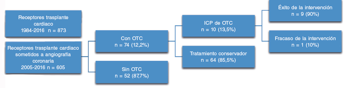 - En este estudio concluimos que realizar ICP en OTC en pacientes seleccionados con trasplante cardiaco es viable en centros experimentados con tasas de éxito de la ICP-intervención sobre la lesión diana y de complicaciones hospitalarias parecidas a las de los receptores de un trasplante cardiaco sin lesiones OTC.