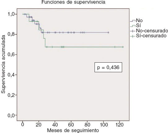 Durante el seguimiento no se observó ninguna diferencia estadísticamente significativa en lo que se refiere a las tasas de mortalidad por cualquier causa y de mortalidad cardiovascular entre ambos grupos (tabla 5). La tasa de mortalidad se situó en torno al 28% (4 de 14) en el grupo OTC y en torno al 14% (5 de 36) en el grupo no OTC (p = 0,245). Por su parte, la tasa de mortalidad cardiovascular fue del 21% (3 de 14) en el grupo OTC y del 8% (3 de 36) en el grupo no OTC (p = 0,331).