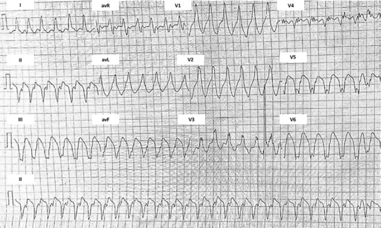 Figura 1. Electrocardiograma inicial. Taquicardia ventricular, origen en el septo medio e inferior del ventrículo izquierdo.