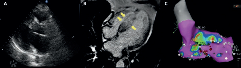 Figura 2. A: ecocardiografía transtorácica. Septo interventricular con diámetro de 32 mm. B: resonancia magnética que muestra la contrastación tardía (flechas). C: estudio electrofisiológico e intento de ablación de macrorreentrada septal. LO: etiqueta de voltaje; RAM: etiqueta de electrograma local.