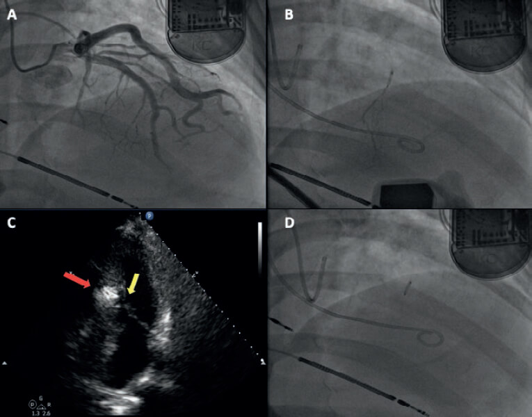 Figura 3. A: coronariografía. B: inyección de contraste burbujeado en la segunda rama septal. C: contrastación de la zona septal susceptible (flecha). D: balón over the wire a través del cual se administró el alcohol.