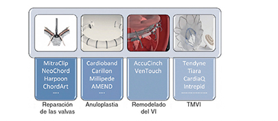 Figura 1. Diferentes abordajes para intervenciones de la válvula mitral. Reimpreso de Taramasso et. al.3 bajo licencia de Europa. Digital & Publishing. VI: ventrículo izquierdo; TMVI: implante de la válvula mitral transcatéter.