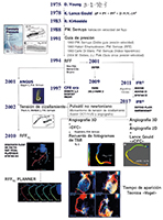 Figura 2. Introducción y evolución de la fisiología coronaria en el laboratorio clínico. 2D: bidimensional; 3D: tridimensional; DFC: dinámica de fluidos computacional; OCT/IVUS: tomografía de coherencia óptica/ecocardiografía intravascular; RFFTC: reserva fraccional de flujo por tomografía computarizada cardiaca; RFE: reserva de flujo estenótico; TIMI: Thrombolysis in Myocardial Infarction.