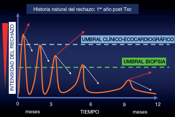 Figura 1. Representación gráfica de la evolución natural del rechazo durante el primer año tras el trasplante cardiaco. Los episodios de rechazo van disminuyendo en intensidad y frecuencia a lo largo del tiempo. Las flechas blancas discontinuas indican la resolución espontánea del rechazo por efecto de la inmunosupresión de base, y las flechas rojas discontinuas indican la progresión continuada del rechazo.
