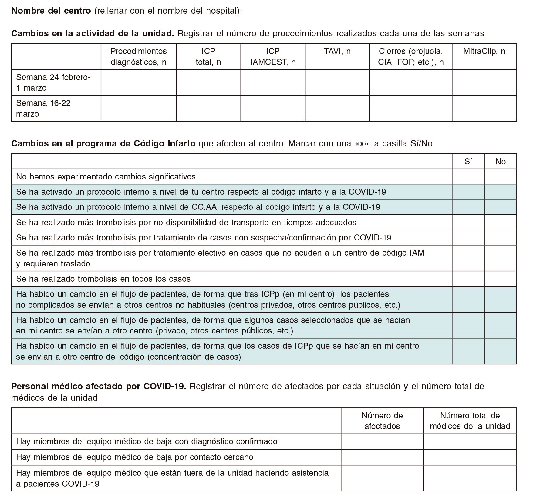 Métodos: Se realizó una encuesta telemática a 81 centros de las 17 comunidades autónomas españolas con procedimientos de código infarto. Se recogió información sobre la actividad diagnóstica, el intervencionismo coronario, el intervencionismo estructural y el intervencionismo en el seno del infarto agudo de miocardio con elevación del segmento ST (IAMCEST) sobre cambios en la organización de las redes del infarto y sobre la afección por COVID-19 de las plantillas de cardiología intervencionista. Se compararon 2 periodos: uno entre el 24 de febrero y el 1 de marzo (antes del inicio de la pandemia en España) y el otro entre el 16 y el 22 de marzo (durante la pandemia).
