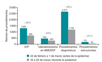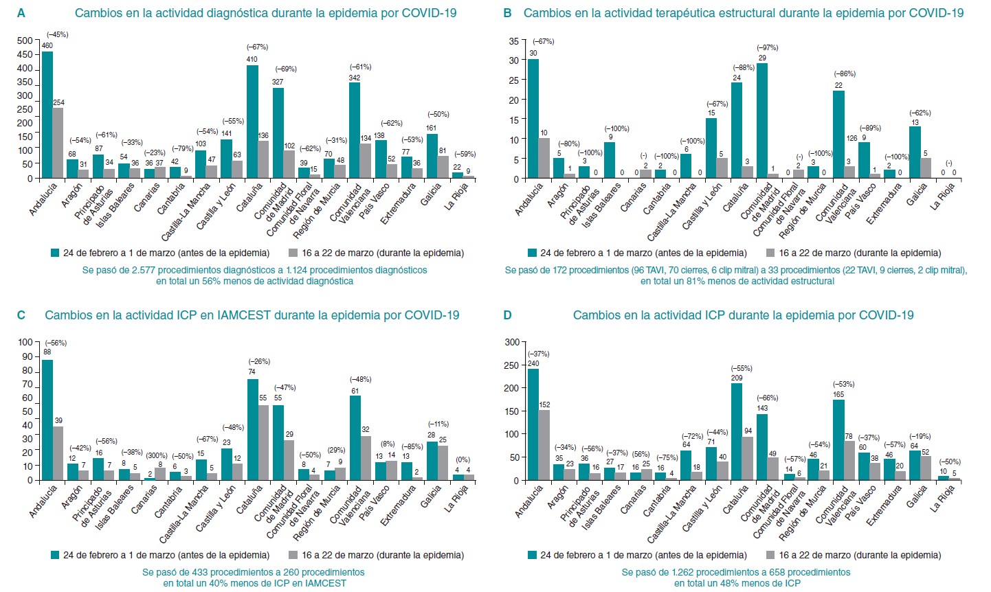 Conclusions: An important reduction in the activity in interventional cardiology has been observed during the COVID-19 epidemic. Likewise, a great decrease has been detected in the number of patients treated in the STEMI networks, with the risk of increased morbidity and mortality that this represents. Scientific societies and health authorities have to promote that patients presenting STEMI compatible symptoms proceed with no delay to access the health system to receive reperfusion treatment in an appropriate way.