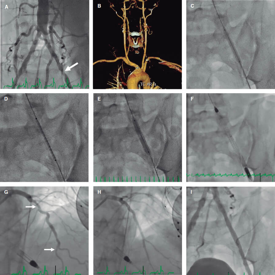 Un varón de 59 años con disfunción ventricular izquierda grave, taquicardia ventricular lenta y previamente tratado con resincronización cardiaca fue derivado para intervención coronaria percutánea (ICP) de la descendente anterior izquierda (DA). El paciente presentaba 2 lesiones extensamente calcificadas en la porción media de la DA. Al tratarse de una ICP de alto riesgo, el equipo multidisciplinar optó por realizar la intervención con soporte ventricular izquierdo percutáneo con el dispositivo Impella CP (Abiomed, Estados Unidos). Al paciente ya se le había realizado una cirugía de derivación fémoropoplítea derecha y presentaba una estenosis muy calcificada en la arteria ilíaca externa izquierda (figura 1A, flecha). La tomografía computarizada realizada en las arterias supraaórticas confirmó la presencia de arterias subclavia y axilar con diámetros < 5mm (figura 1B). El dispositivo Impella CP (14 Fr), que requiere un diámetro mínimo del vaso de 5 mm, se implantó mediante abordaje femoral izquierdo tras angioplastia de la arteria ilíaca externa izquierda. Para la predilatación se usó un catéter balón Mustang para ATP de 5 x 40 mm (Boston Scientific, Estados Unidos) (figura 1C); después se implantó un stent recubierto expandible por balón Advanta V12 de 6 x 38 mm (Atrium Medical Corporation, Estados Unidos) (figura 1D-E). Se avanzó el dispositivo Impella CP a través del stent (figura 1F). En la ICP de la porción media de la DA se emplearon 2 stents farmacoactivos (figura 1G-H; flechas: lesiones en la porción media de la DA). Tras la ICP, se retiró el dispositivo Impella CP; el punto de acceso vascular se cerró con el sistema de sutura Perclose ProGlide (Abbott Vascular Inc., Estados Unidos). La angiografía de control confirmó los buenos resultados (figura 1I, vídeo 1 del material adicional).