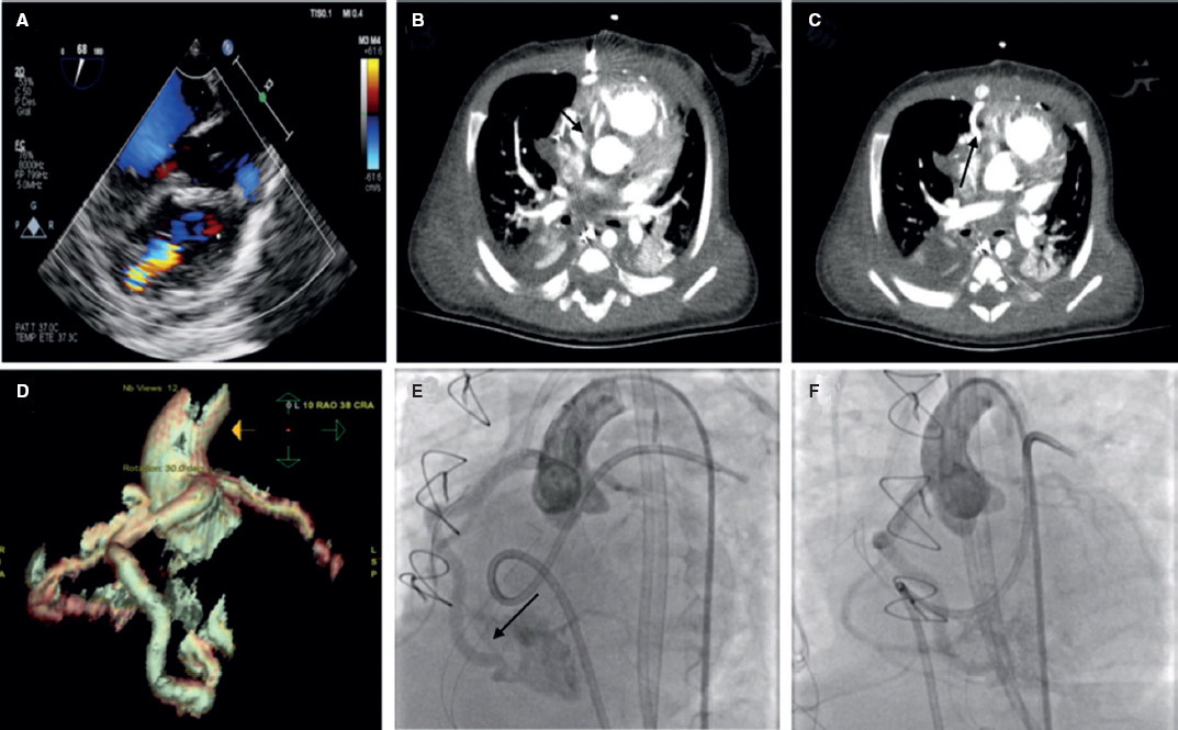 Lactante de 2 meses recientemente intervenido de cierre de comunicación interventricular perimembranosa con clínica congestiva en el posoperatorio y sospecha ecocardiográfica de posible fístula de coronaria derecha a ventrículo derecho, confirmada con la realización de una tomografía computarizada cardiaca y un cateterismo con coronariografía no selectiva. Se obtuvo el consentimiento informado de los padres para la difusión del caso. Se observa una gran fístula coronaria desde la rama marginal de la coronaria derecha desembocando en la cavidad del ventrículo derecho con gran dilatación del segmento proximal de la coronaria derecha (figura 1) favorable para cierre percutáneo. Con un catéter transportador de 4 Fr sondando la coronaria derecha se avanza una guía coronaria hasta el ventrículo derecho y, asistido por balón de angioplastia, se avanza el catéter transportador hasta la zona proximal de la fístula, donde se libera un dispositivo Amplatzer Vascular Plug (AVP4) (Abbott, USA) 4 × 6, con oclusión completa del defecto sin interferencia con la coronaria derecha distal (figura 2).