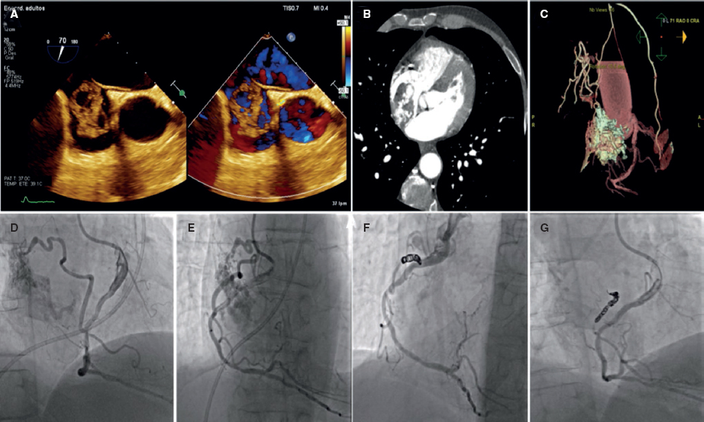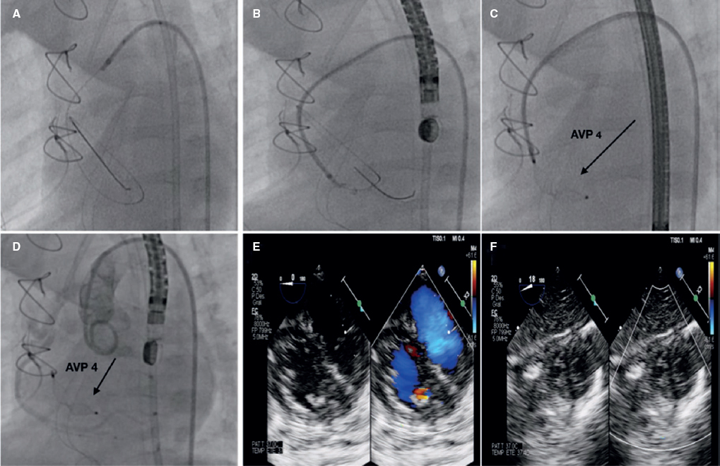 Varón de 70 años con hallazgo casual por ecocardiografía transtorácica y transesofágica de una gran masa en la aurícula derecha con abundante componente vascular, y tras su estudio con tomografía computarizada cardiaca se confirma el hallazgo de una malformación arteriovenosa. Se obtuvo el consentimiento informado del paciente para la difusión del caso. Se realiza estudio coronariográfico que muestra aferencia desde la coronaria derecha media hacia la masa auricular, por lo que se decide el cierre percutáneo. Este se lleva a cabo con microcatéter avanzado hasta la zona media de la rama aferente y protegiendo mediante inflado de balón de angioplastia en la coronaria derecha media. Se liberan 10 Hilal Coils (Cook Medical, USA), con buen resultado y cierre completo del defecto (figura 3).