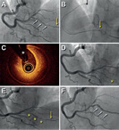 Mujer de 41 años que se presenta con un infarto de miocardio con elevación del segmento ST inferolateral. La coronariografía confirmó la presencia de una lesión larga en una rama posterolateral de la coronaria derecha (figura 1A, flechas blancas). El operador optó por realizar una tomografía de coherencia óptica (OCT) para confirmar la sospecha de disección coronaria espontánea. Como era difícil avanzar el catéter de la OCT, debido a la falta de soporte, se optó por interrogar únicamente el aspecto más proximal de esta rama (figura 1B, flecha). La OCT reveló la presencia de un hematoma intramural sin rotura intimal como puerta de entrada (figura 1C; los asteriscos señalan el artefacto de la guía). En ese momento, la paciente se quejó nuevamente de dolor torácico que se mantuvo hasta la retirada del catéter de la OTC. Se confirmó la presencia de oclusión funcional de la rama estudiada (figura 1D, asterisco) con flujo grado TIMI 1 (Thrombolysis in Myocardial Infarction). Se reestableció el flujo coronario mediante dilatación cuidadosa (balón de 1,5 mm de diámetro a 4 atmósferas). Finalmente se alcanzó un flujo TIMI 2 (figura 1E, asteriscos) con desaparición de los síntomas. La evolución clínica posterior cursó sin eventos. La angiografía coronaria que se realizó 3 meses después confirmó la reparación total del vaso con curación de todo el segmento que inicialmente mostraba la disección (figura 1F, flechas).