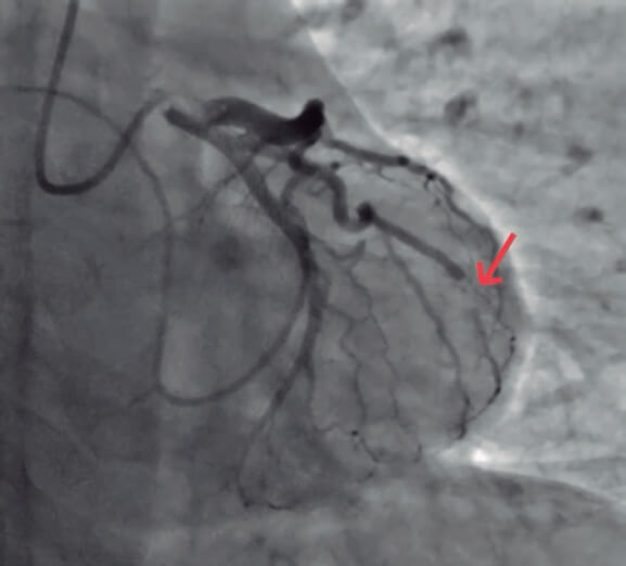 Se realizó una coronariografía precoz que mostró el trombo en la bifurcación distal de la arteria circunfleja (figura 1, flecha).