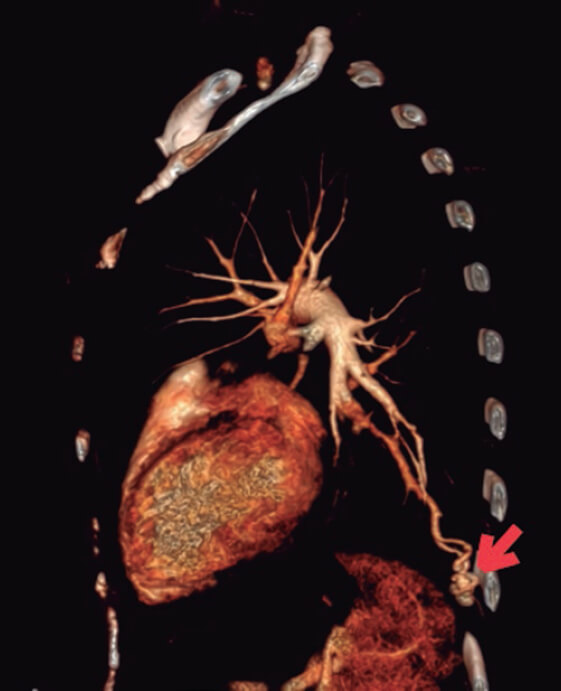 Para descartar un foco embolígeno se completó el estudio con ecografía Doppler de miembros inferiores, en la que no se observaron signos de trombosis venosa profunda. Dado el antecedente sindrómico de la paciente, se realizó una angiotomografía de tórax en busca de fístulas arteriovenosas pulmonares, y se confirmó la presencia de 2: una dependiente del territorio pulmonar izquierdo en el segmento posterobasal (figura 2, flecha) y otra, de menor tamaño, en el segmento laterobasal homolateral.