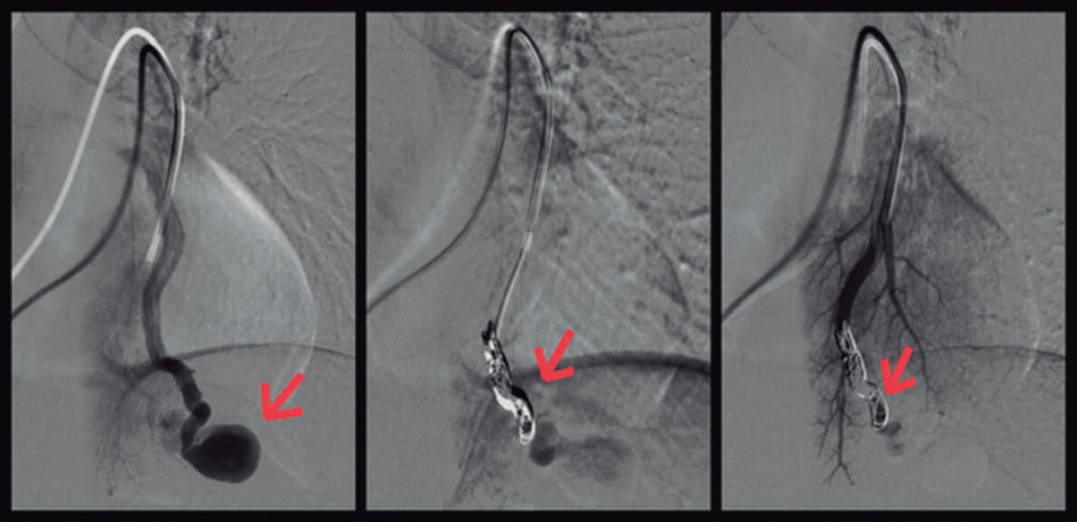 El servicio de intervencionismo procedió al cierre de las fístulas mediante microcateterización selectiva de las arterias segmentarias aferentes a ellas y embolización con coils (figura 3, flechas).