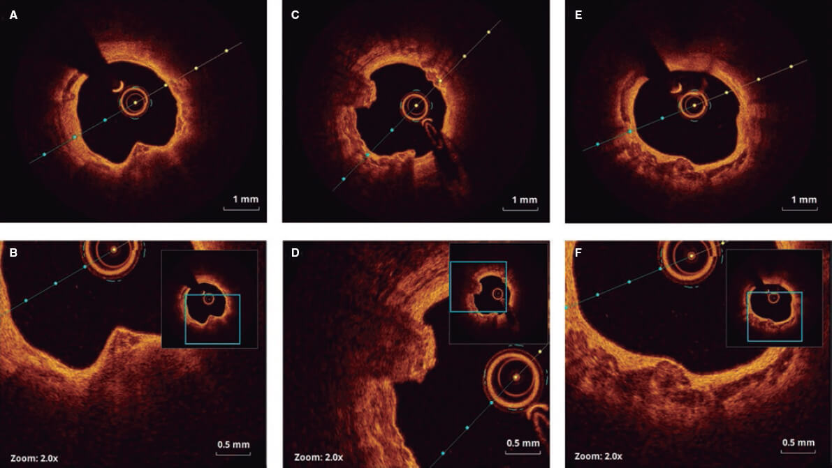 Figura 1. Pullback de OCT desde la arteria radial. Patrones de protrusión calcificada (A-B), nódulos calcificados eruptivos (C-D) y placa calcificada superficial en sabana (E-F).