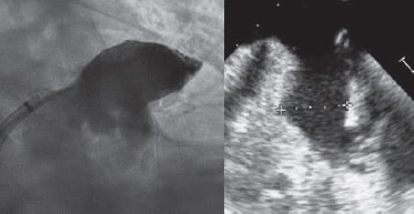 La intervención se llevó a cabo con un dispositivo Amulet de 28 mm. Se avanzó una vaina introductora de 14 Fr por vía transeptal a la aurícula izquierda y, tras una angiografía selectiva, se implantó el dispositivo dentro de la orejuela de forma habitual. Como el dispositivo no se colocó bien la primera vez (parcialmente fuera de la orejuela) hubo que recapturarlo. En el segundo intento y con una importante rotación de la vaina en sentido antihorario, el cuerpo del dispositivo quedó colocado con un peculiar «retorcimiento» (figura 2) con el extremo distal dentro de la orejuela. Se recapturó con cuidado y, tras descartar derrame pericárdico, se reimplantó, esta vez correctamente, sin ser necesario cambiar el dispositivo (figura 3). La ecocardiografía transtorácica realizada al día siguiente descartó la presencia de derrame pericárdico. La ETE que se realizó al cabo de 1 mes descartó la presencia de fugas o trombos en el dispositivo.