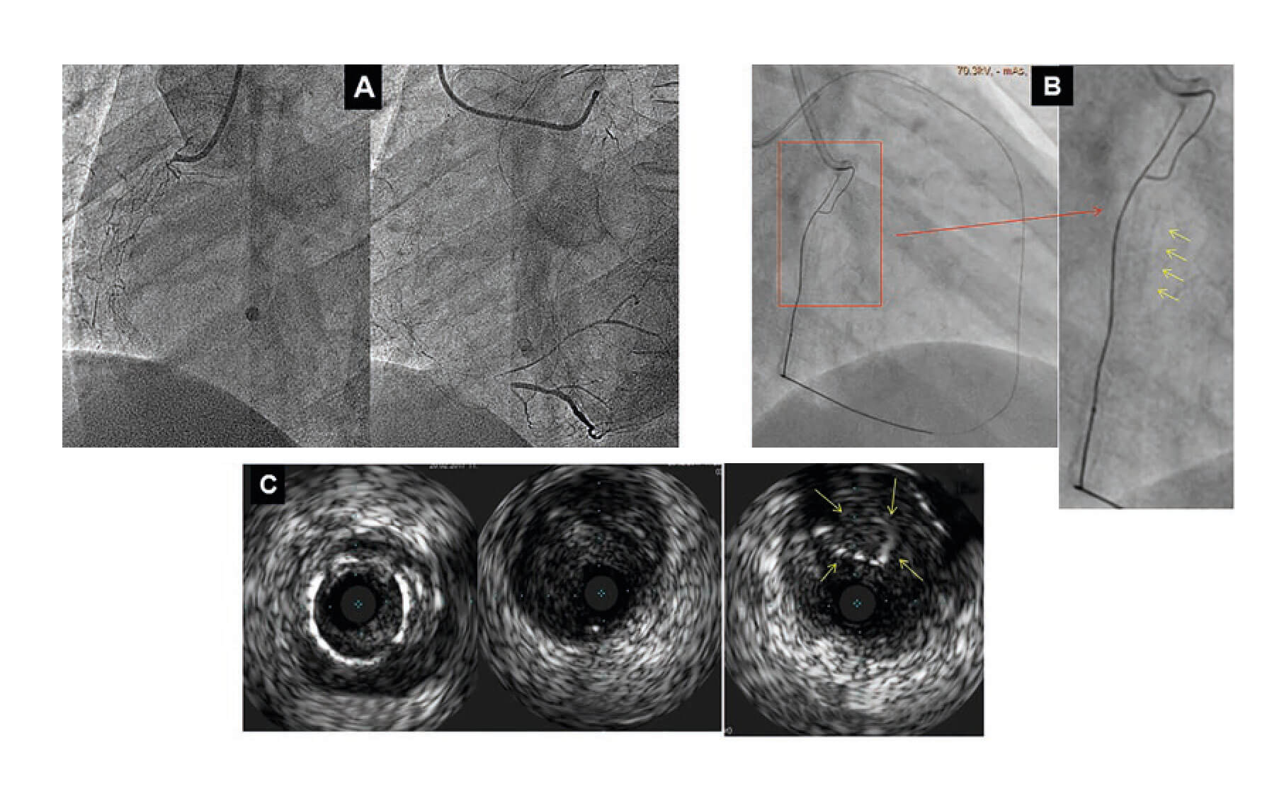 Varón de 48 años hospitalizado con un cuadro de angina estable. La coronariografía mostró una oclusión crónica total de coronaria derecha (ACD) por reestenosis de stents previos, desde el ostium hasta la cruz. (figura 1A). Se realizó un abordaje retrógrado tras un intento anterógrado fallido. En el tercio medio de la ACD, la guía avanzó por fuera del stent (flechas) (figura 1B). La ecografía intravascular (IVUS) realizada confirmó la correcta posición de la guía en el extremo distal del stent. Sin embargo, en el espacio existente entre ambos stents, la guía avanzó por el espacio subadventicial y esta posición se mantuvo a lo largo de toda la longitud del stent proximal (flechas) (figura 1C).