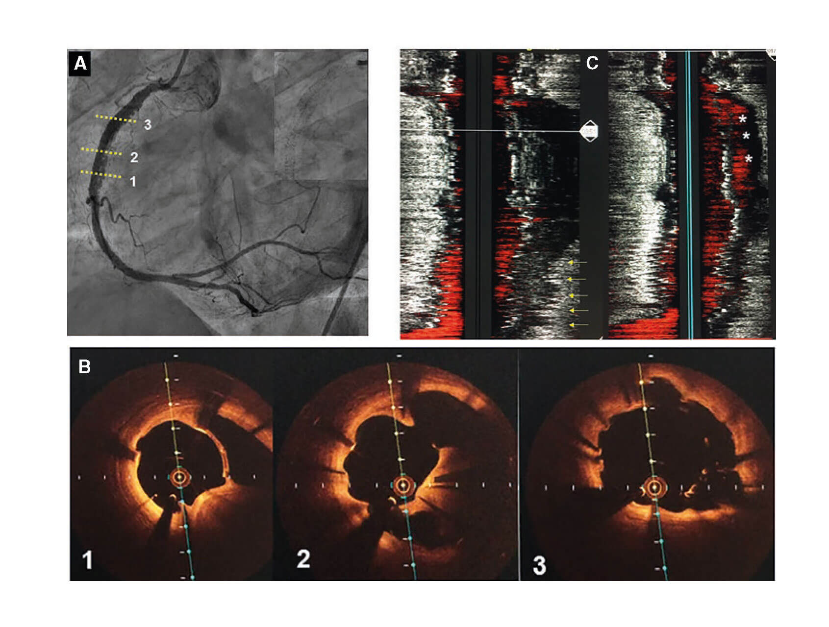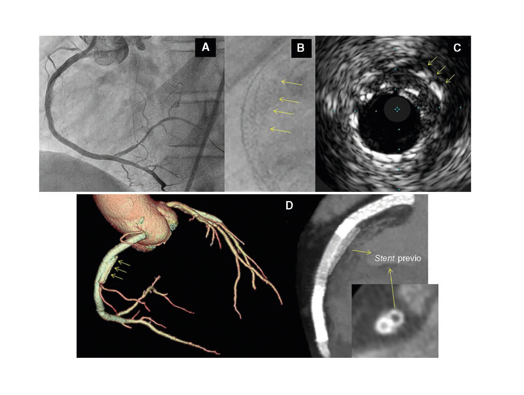Tras la predilatación, se implantaron con éxito 3 stents fármacoactivos (figura 2A). En las imágenes de la angiografía e IVUS obtenidas puede verse un doble stent (figura 2B y figura 2C): el implantado con anterioridad (flechas) y los más recientemente implantados. La tomografía computarizada, realizada 3 meses después, confirmó la exclusión del stent previo (flechas) del flujo coronario y la per- meabilidad de los stents implantados en el espacio subadventicial (figura 2D). Seis meses después de realizar el procedimiento índice, una nueva valoración angiográfica confirmó los buenos resultados a medio plazo (figura 3A). No obstante, la tomografía de coherencia óptica reveló una significativa mala aposición tardía del stent (figura 3B). Asimismo, los cortes longitudinales de la IVUS mostraron el stent previo ocluido (flechas) y, en otro plano, la mala aposición del stent (asteriscos) (figura 3C) debida probablemente a la reabsorción del hematoma inducida durante el proceso de recanalización. El paciente permanecía asintomático y se optó por mantener tratamiento con ácido acetilsalicílico y ticagrelor programando una nueva reevaluación a los 18 meses de seguimiento.