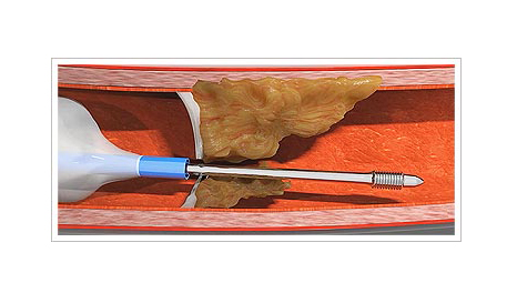 Una vez hinchado el globo, se avanza la guía como si fuese un tirafondo, se gira en sentido horario para avanzar y, una vez atraviesa la placa, se gira en sentido antihorario para sacarla. Cuando penetra la placa se puede utilizar la guía convencional de oclusión crónica total que el cardiólogo intervencionista desee.