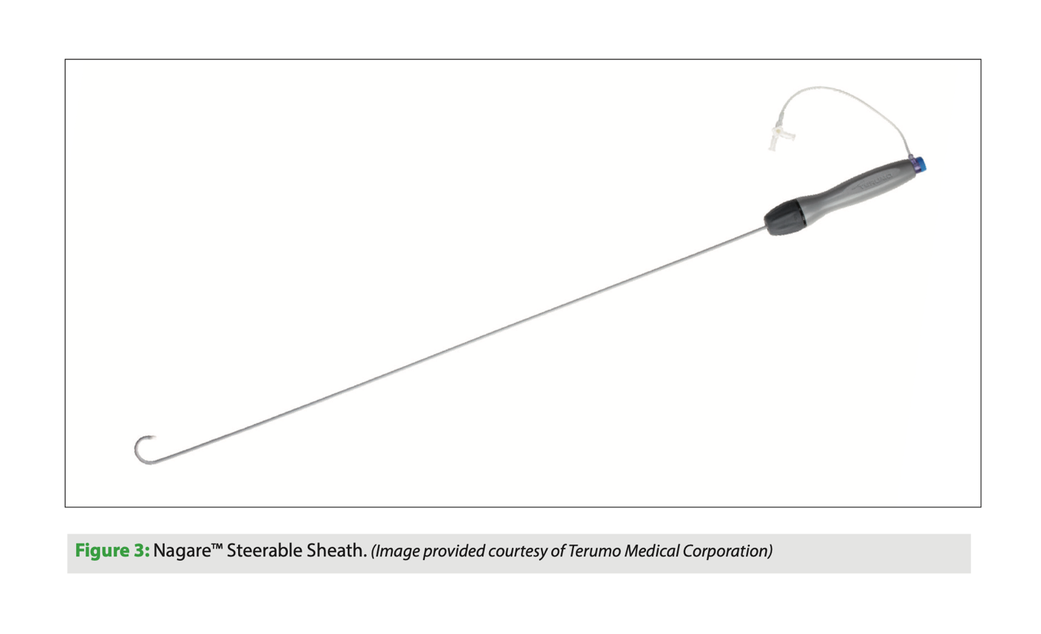 El introductor deflectable bidireccional Nagare (Terumo, Japón) es un catéter que permite navegar en todas las cámaras cardiacas de manera controlada. El movimiento de la vaina es bidireccional gracias a la tecnología TrueVector: el dispositivo está fabricado con una malla coaxial, a diferencia de otros que tienen en su interior unas guías que se traccionan proximalmente con el mango para mover la punta del catéter. La malla, recubierta de Klevar, se mueve libremente y, al ser traccionada proximalmente con el mango, permite deflectar solo el extremo con precisión y estabilidad, evitando el clásico efecto látigo de otros catéteres similares. En estos, la deflexión es de todo el catéter, no solo de la punta; esto es una mejora interesante.