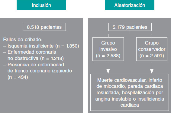 De 8.518 pacientes cribados, se aleatorizó a 5.179 para seguir una estrategia INV (n = 2.588) o CON (n = 2.591), y se hizo un seguimiento durante una mediana de 3,3 años (figura 1). Las características basales de ambos grupos no diferían de manera significativa7,8. La edad media fue de 64 años y el 23% de los pacientes eran mujeres. La fracción de eyección media era del 60%. En el 75% de los casos se realizó un test de isquemia con imágenes y en el 25% restante se realizó una ergometría. De los pacientes aleatorizados, un laboratorio centralizado determinó que el 54% tenían isquemia grave, un 33% moderada, un 12% ligera o ausente, y un 1% no interpretable. Entre los pacientes de la rama INV se revascularizó al 80%; el 74% mediante ICP y el resto mediante cirugía de revascularización coronaria. De los pacientes no revascularizados, dos tercios no tenían enfermedad coronaria significativa y un tercio presentaban enfermedad coronaria extensa no revascularizable.