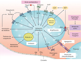 Figura 1. Mecanismos de activación plaquetaria. La activación plaquetaria se inicia mediante agonistas solubles como la trombina, el tromboxano A2 (TXA2), la 5-hidroxitriptamina 5-HT), el adenosín difosfato (ADP [mediante interacción con el receptor purinérgico P2Y12) y el adenosín trifosfato (ATP) y mediante ligandos de adhesión como el colágeno y el factor de von Villebrand (vWF). Como consecuencia, la densa secreción granular de los agonistas plaquetarios y la secreción de TXA2, resultante de la activación de la fosfolipasa A2, amplifican la activación plaquetaria y respuestas asociadas. El receptor purinérgico P2Y12 juega un papel fundamental en la amplificación de la activación plaquetaria, que también se ve apoyado por una señalización de fuera hacia adentro vía integrina αIIbβ3 (el receptor de la glucoproteína IIb/IIIa). De ahí que el bloqueo conjunto de P2Y12 e integrina αIIbβ3 tenga efectos sumativos tanto en la activación plaquetaria como en las respuestas plaquetarias asociadas. 5-HT2A: receptores 5-HT2A; GPVI: glucoproteína plaquetaria IV; ON: óxido nítrico; PAR: receptor activado por proteasas; PGI2: receptor de la prostaciclina; TPα: isoforma α del receptor TXA2. Adaptado de Capodanno et al9. con permiso de Springer Nature Ltd.