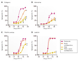 Figura 2. Ante un potente bloqueo del receptor P2Y12, el ácido acetilsalicílico ofrece poca inhibición adicional de la agregación plaqueta- ria. En estos estudios, la agregación plaquetaria se indujo a través de cuatro agonistas plaquetarios distintos: colágeno 0,1–30,0 μg/ml (parte A), adrenalina 0,001–100,0 μmol/l (parte B), antagonista sintético TRAP-6 amida (H-Ser–Phe–Leu–Leu–Arg–Asn–NH2) del receptor activado por la proteasa 1 (PAR1) 0,1–30,0 μmol/l (parte C) y tromboxano A2 miméticó U46619 0,1–30,0 μmol/l en presencia de ácido acetilsalicílico 30,0 μmol/l y/o del metabolito activo de prasugrel (PAM) 3,0 μmol/L (part d). Los datos se expresaron en medias ± desvia- ciones estándar de las respuestas medias calculadas mediante agregometría en microplaca de 96 pocillos en plasma rico en plaquetas obtenido mediante centrifugación de sangre citrada y preparado por cuatro técnicos distintos. *p 0,05 para la diferencia del vehículo mediante análisis de la varianza de dos factores (ANOVA) y prueba post hoc de Bonferroni. †p 0,05 para la diferencia entre PAM y PAM más ácido acetilsalicílico. Los símbolos que aparecen al final de las líneas expresan diferencias en conjuntos o grupos; los que aparecen en puntos determinados expresan diferencias particulares. Adaptado de Capodanno et al9. con permiso de Springer Nature Ltd.