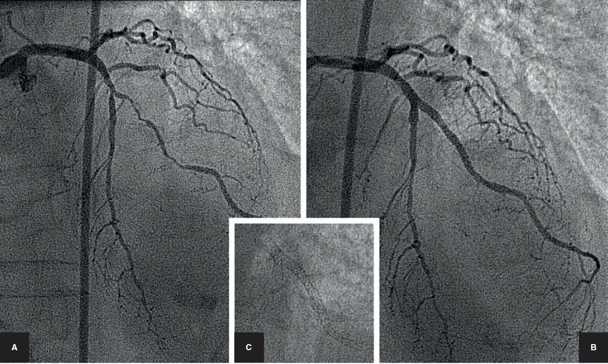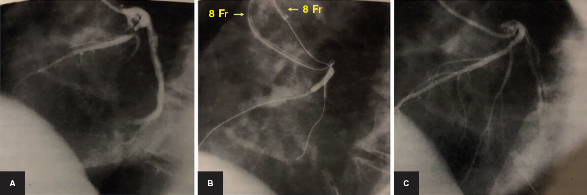 Figura 1. Bifurcación en la arteria descendente anterior/rama diagonal. Tratamiento percutáneo en la era anterior a los stents. A: angiografía basal. B: dilatación con balón de la descendente anterior y diagonal. Dos catéteres guía femorales de 8 Fr con guías y balones independientes para realizar una dilatación simultánea de los balones (kissing balloon). C: resultado final.