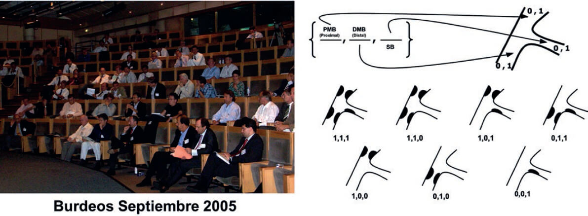 Figura 2. A la izquierda: reunión de Burdeos en septiembre de 2005, en la que se propuso la clasificación de Medina como la única aceptada por el European Bifurcation Club. A la derecha: clasificación de Medina, reproducida con permiso de Medina et al.6. DMB: distal main branch (vaso principal distal); PMB: proximal main branch (vaso principal proximal); SB: side branch (rama lateral).