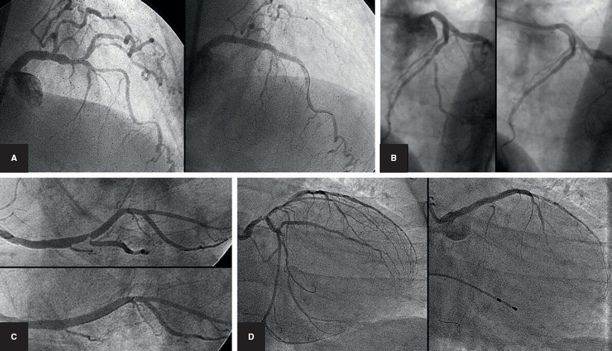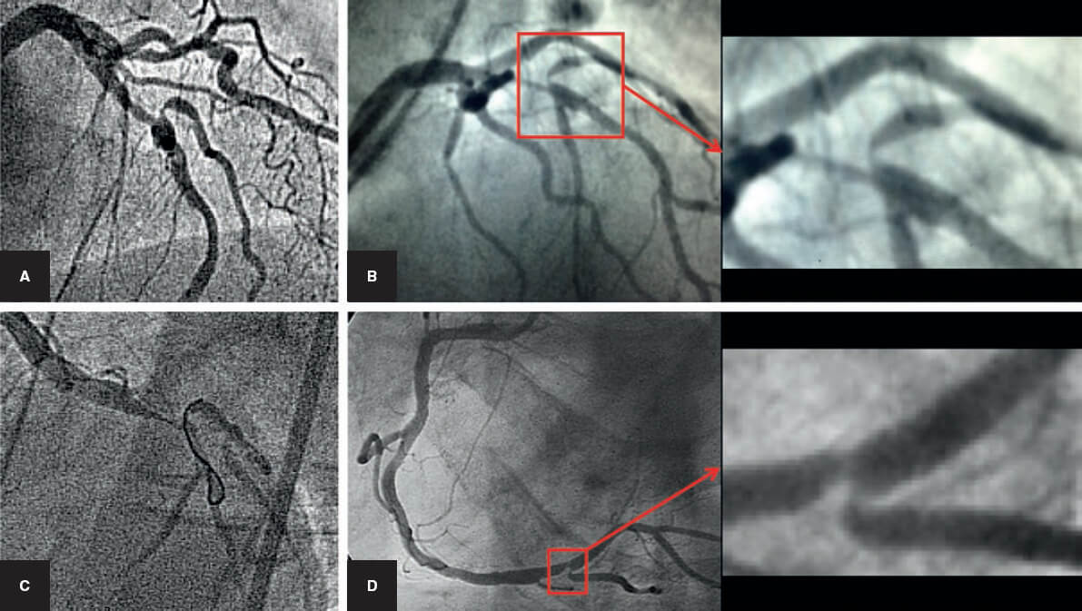 Figura 3. Cuatro ejemplos de oclusión abrupta de la rama lateral tras el implante del stent en el vaso principal. A y B: descendente anterior/diagonal. C: coronaria derecha/descendente posterior. D: tronco común de la coronaria izquierda con cierre de la arteria circunfleja.