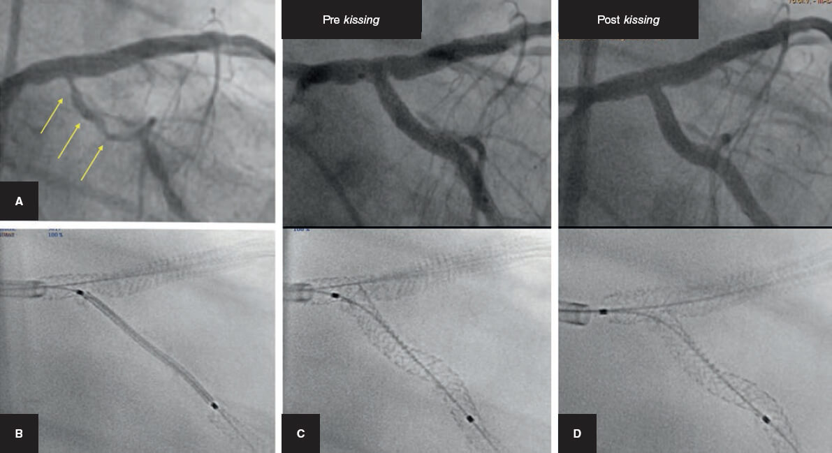 Figura 4. Acceso difícil a la rama lateral. A, B y C: arteria descendente anterior/diagonal. D: coronaria derecha/descendente posterior. A la derecha: detalle ampliado del ángulo de la bifurcación.