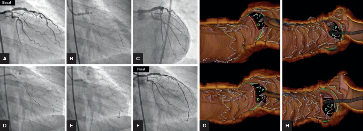 Figura 7. Tratamiento de una lesión ostial de la descendente anterior con la técnica del stent provisional. A: angiografía basal. B: stent en tronco/descendente anterior. C: compromiso del origen de la arteria circunfleja. D: dilatación de la circunfleja. E: redilatación proximal (Re-POT). F: resultado angiográfico. G: tomografía de coherencia óptica, wiring incorrecto de la circunfleja a través de la celdilla proximal (P). H: tomografía de coherencia óptica en la que tras un segundo intento la guía aparece a través de la celdilla distal (D), donde finalmente se efectúa la dilatación.