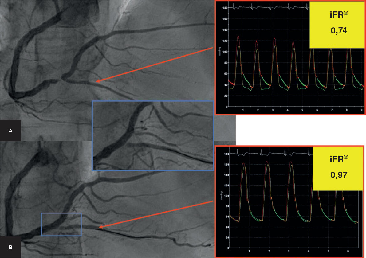 Figura 8. Monitorización del resultado sobre la rama lateral (descendente posterior) con el cociente diastólico instantáneo sin onda (iFR). A: angiografía basal. B: tras el implante del stent en el vaso principal (coronaria derecha). Compromiso angiográfico del origen de la descendente posterior con un iFR > 0,90, por lo que no se precisa dilatación ulterior.